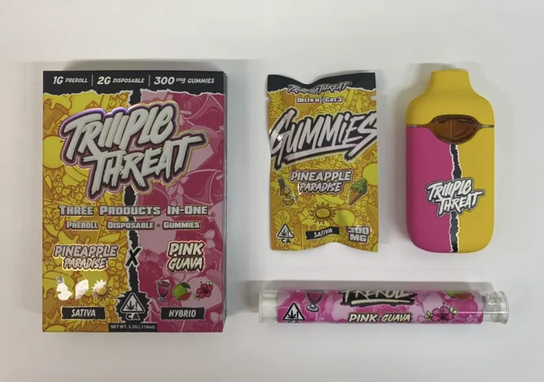 The Triiiple Threat 2g in Pineapple Paradise x Pink Guava is liquid sunshine. This exotic blend brings together two heavyweights of the fruit world:- Pineapple Paradise: delivers a sharp, tangy kick of golden pineapple on the inhale.